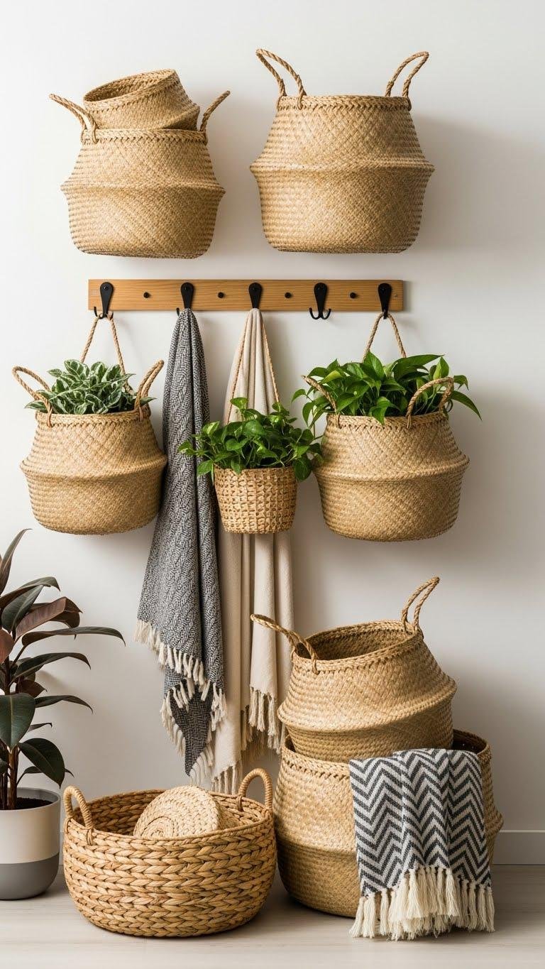 Woven-basket arrangements bring both form and function to a room, giving you smart storage that also reads like sculptural decor. Choose natural baskets in varied weaves and sizes to layer texture—stacked, hung, or clustered.