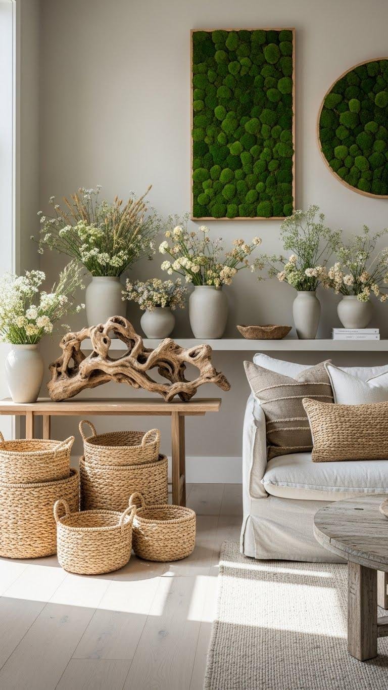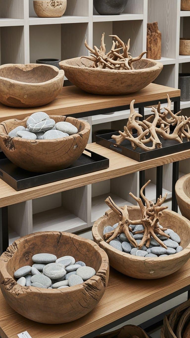 Move from woven baskets to rough wooden bowls and natural objects to add a grounded, tactile counterpoint that feels both organic and curated.