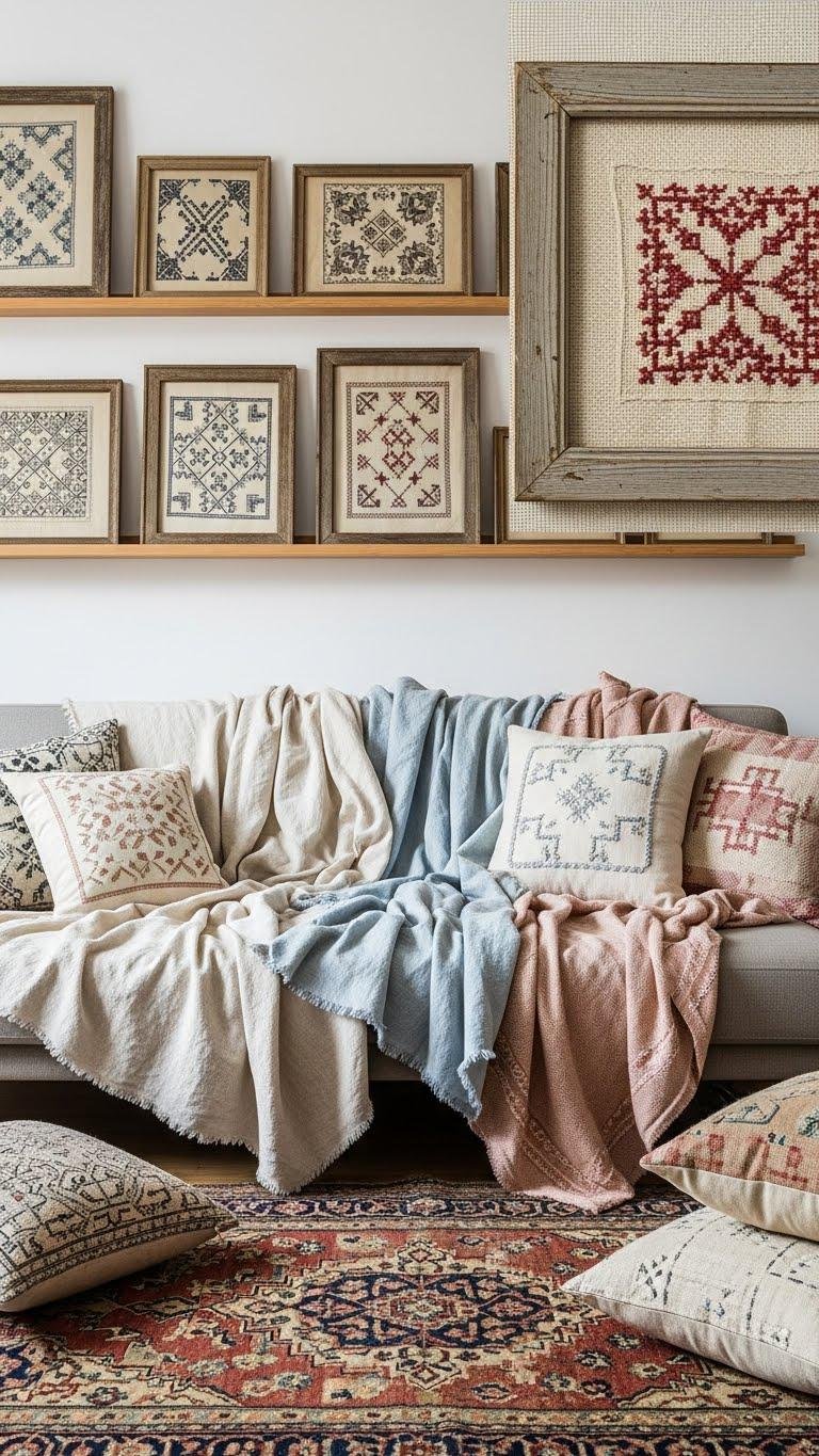 Bring in vintage textiles and cross-stitched pieces to soften hard edges and inject history into your rooms. Layer antique samplers on open shelves, frame them as art, and drape faded linens over sofas for instant patina. You’ll create lived-in contrast against modern lines, mixing curated nostalgia with minimalist freedom.