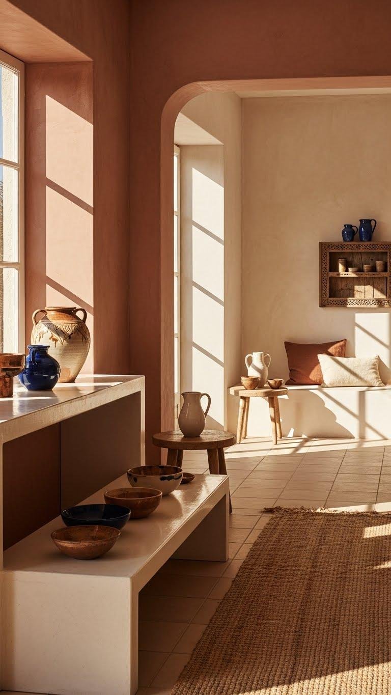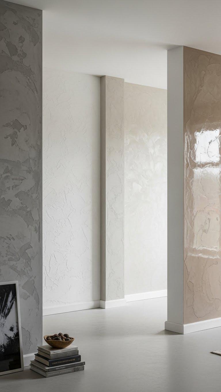 You’ll embrace effortless texture: smooth tadelakt technique for polished, water-friendly walls or a matte lime wash for breathable, sunlit patina. Pair with sun-soaked ceramics and open layouts to keep spaces airy, bold, and free-spirited while feeling grounded and timeless.