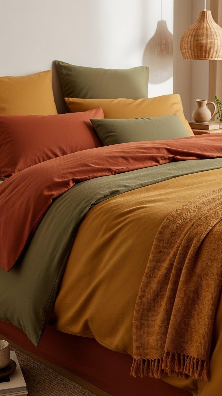 When you swap in linens and layers in warm earth tones—terracotta, olive, caramel, and ochre—your bedroom immediately feels grounded and inviting; the colors soften harsh light, highlight natural textures, and make even a minimalist space cozy.