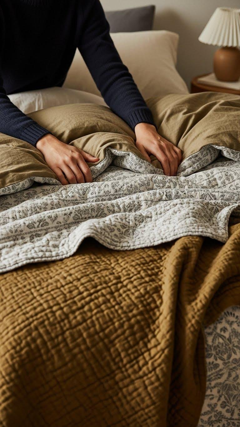 Carry the warmth of those earth tones into your bedding by layering a lightweight quilt over a plush duvet—this combo gives your bed instant depth and a lived-in, tactile feel.