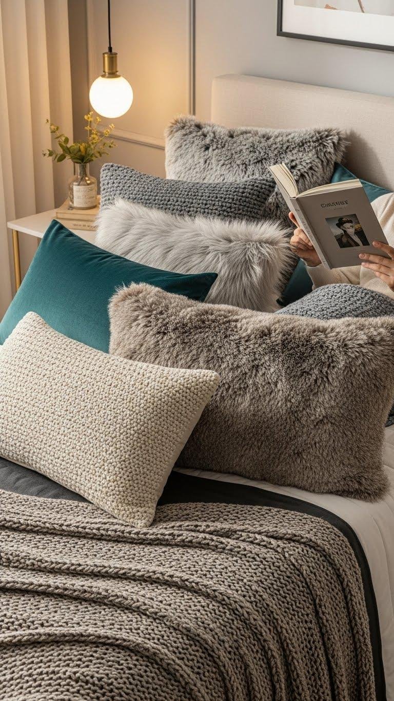 Pile on oversized throw pillows in plush textures to instantly make your bed feel indulgent and inviting. You’ll want a mix of tactile fabrics—velvet, faux fur, chunky knit—that invite touch and rest.