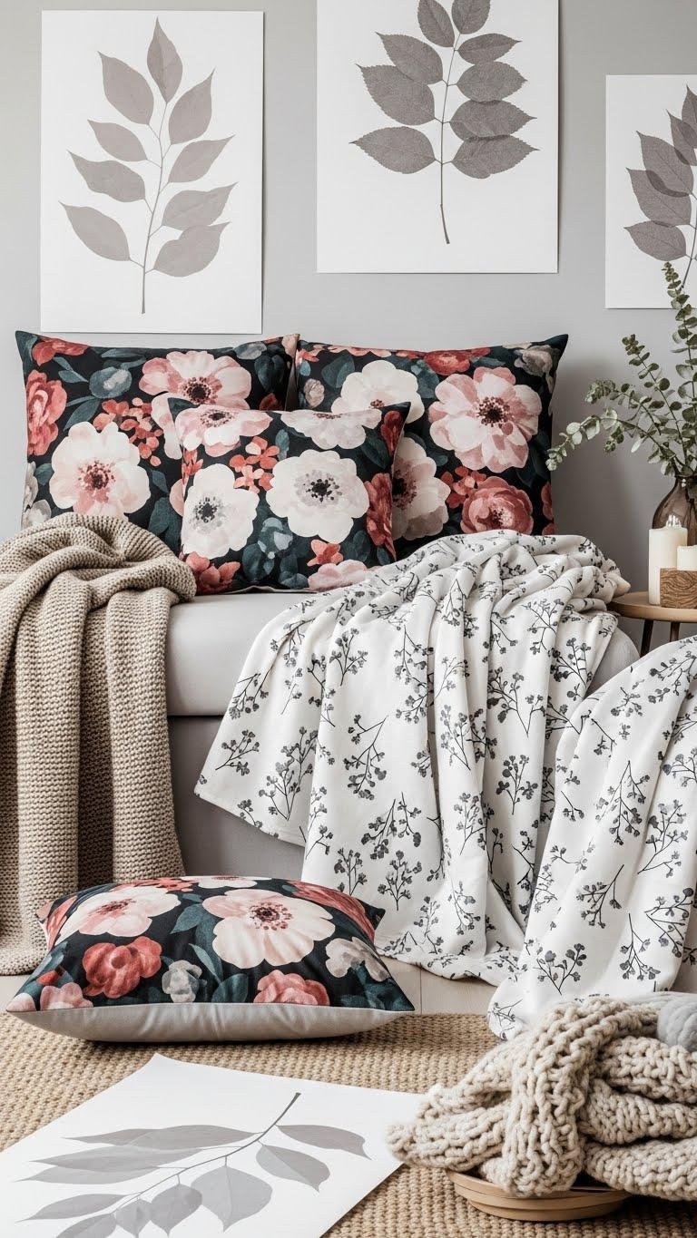 Introduce floral or nature-inspired prints to soften the room and add a whisper of seasonal charm—think oversized blooms, delicate sprigs, or muted leaf patterns that read as modern rather than fussy. You’ll layer botanical silhouettes on cushions and throws, pair meadow motifs with warm textures, and keep palettes restrained so prints feel liberating, tactile, and quietly invigorating without overpowering your restful winter refuge.