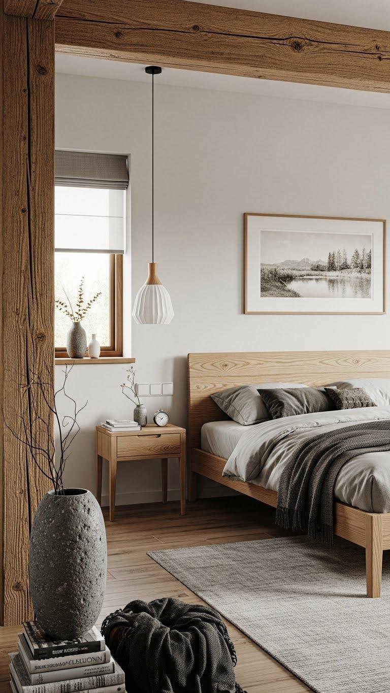 If you want a bedroom that feels both serene and grounded, blend Japandi’s spare, light-filled lines with the tactile warmth of rustic retreat pieces.