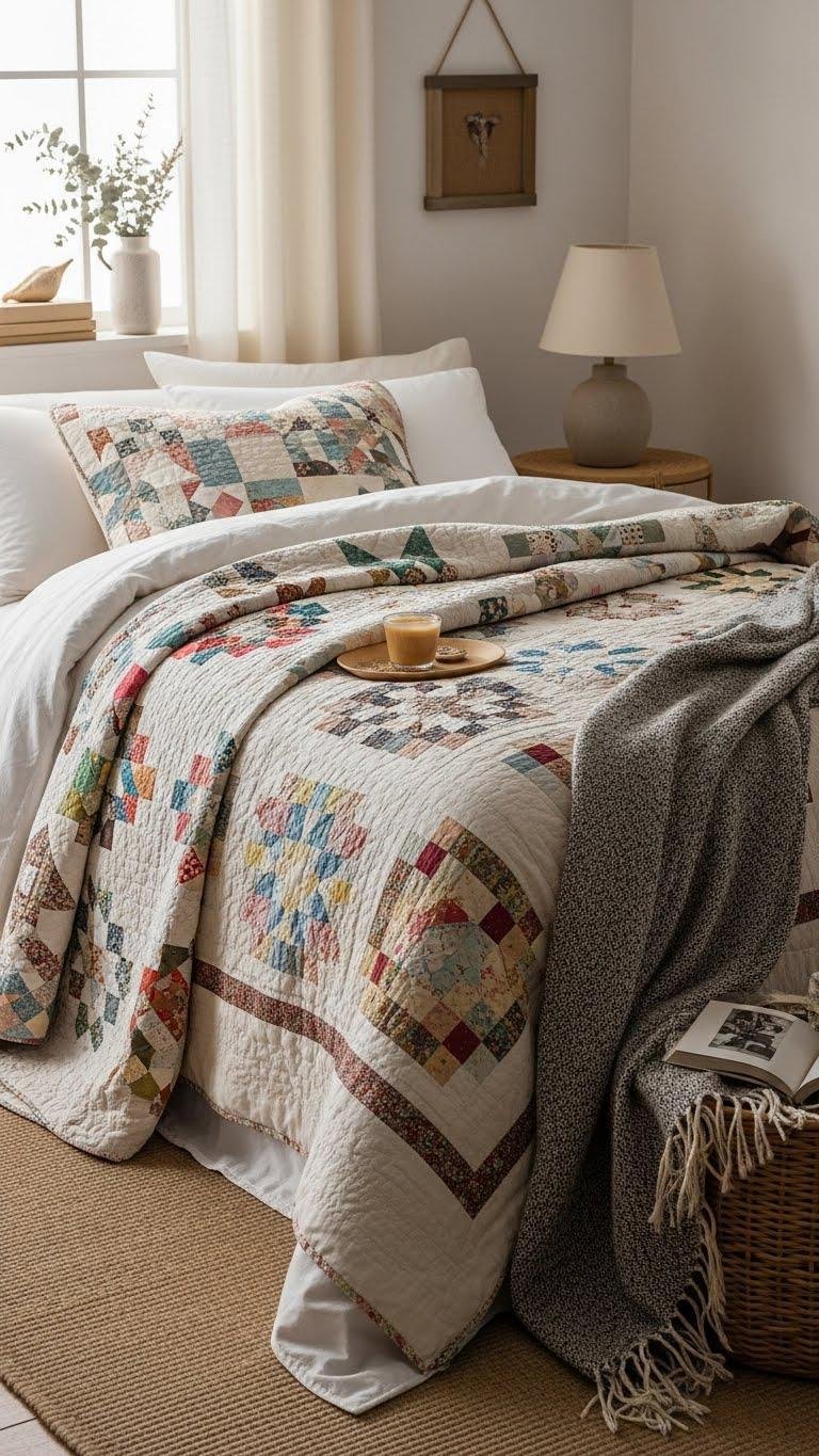 Carry the Japandi-rustic calm into your bedding by layering plush textures and a handmade quilt as the focal point. You’ll drape hand stitched layers over soft throws, mix quilt block patterns for visual rhythm, and choose heirloom fabrics that smell faintly of history.