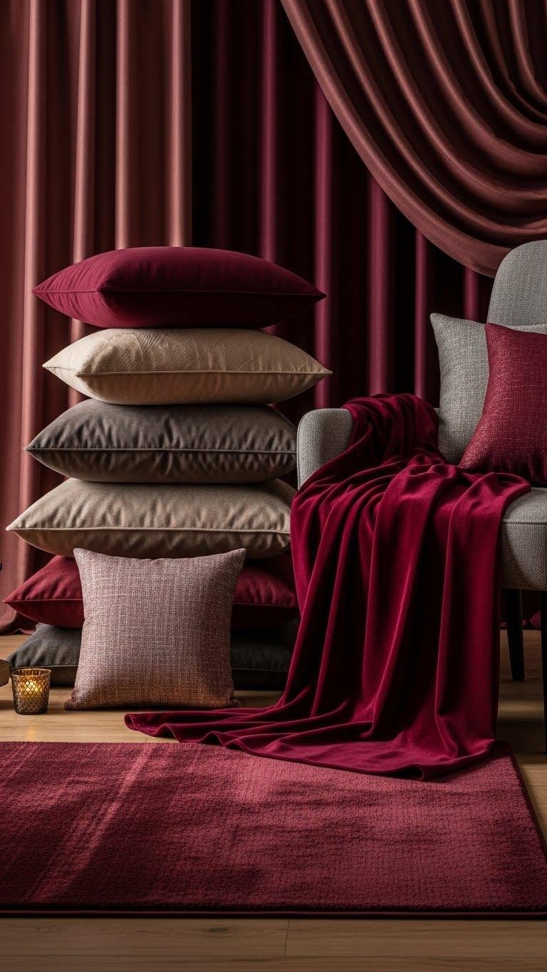 After you’ve layered plush pillows for tactile comfort, bring in deep cherry and burgundy accents to lend the room a warm, moody richness.