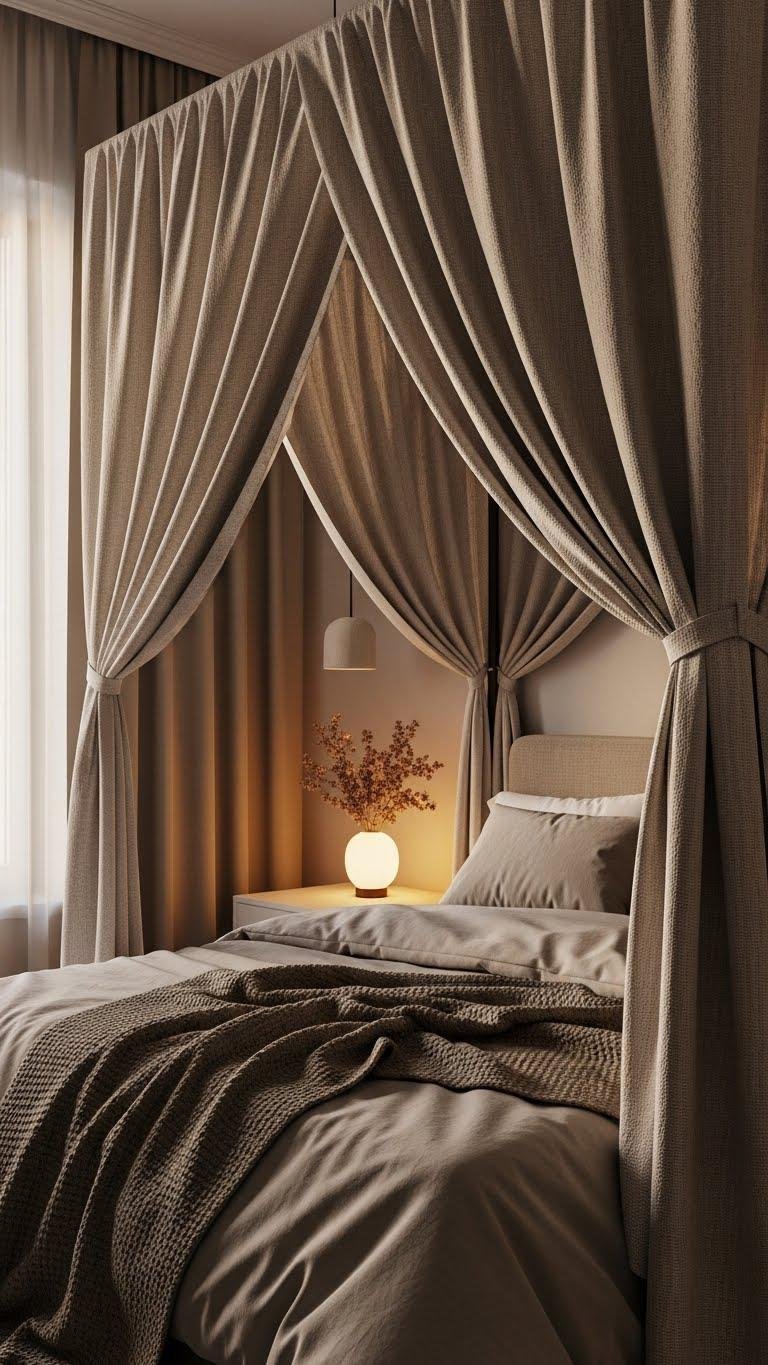 Tuck yourself into a canopy bed to create an immediate sense of shelter and warmth—draped fabric, soft overhead lines, and a slightly enclosed footprint make the bed feel like a private nook where mornings stretch and evenings sigh.