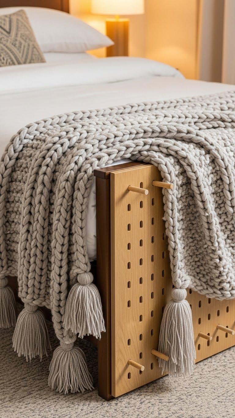 Layer it loosely so chunky tassels tumble casually, creating movement and warmth. Secure a corner on a wooden pegboard for a practical, liberated look that feels intentional without fuss.